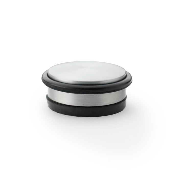 It is a solid brass door stop in a fresh and contemporary satin chrome finish, with a rubber ring around the circumference to cushion the door and a rubber base to help stop it from slipping.