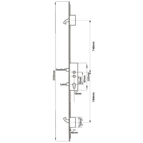 Avantis gearboxes are unique in the market, featuring a distinctive grooved deadbolt sitting above the latch. The deadbolt measures 30mm high and extends 25mm when thrown. The distance from the bottom of the deadbolt to the top of the latch is 60mm and the latch is 24mm high.