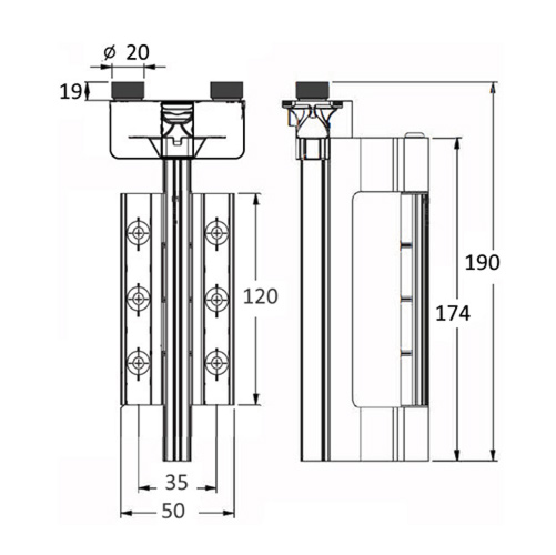 A replacement top guide & hinge to repair existing AF70 bifold installations. This top guide assembly is used above the roller at the top of bi-fold door installations wherever two hinged door leaves sit in the running track. It works with the bifold roller to support moving door panels at the top, to ensure that the door stays in the track.