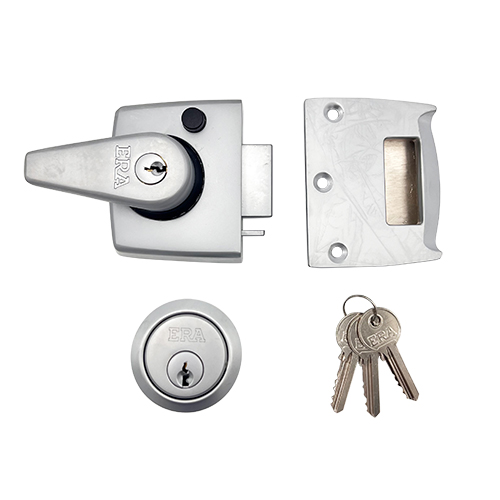 These ERA double-locking nightlatches automatically deadlock on closing, due to the snib, preventing the main latch bolt being ‘slipped’ open from outside. Ideally suited for solid and glazed panelled timber doors between 35mm and 60mm thick. The modern styling and solid contruction have helped make this a popular nightlatch. A 5 pin rim cylinder and 3 keys come supplied as well as all fixings.