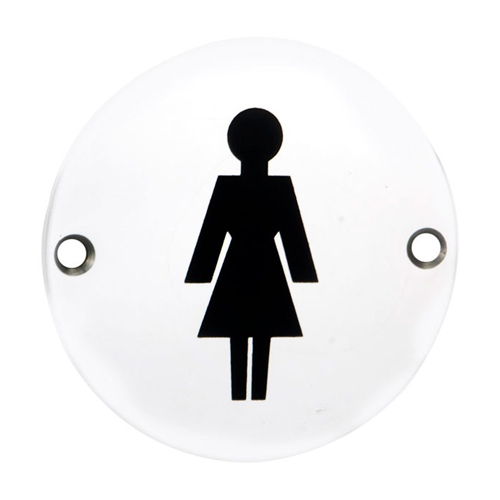 Female Symbol, part of the Steelworx signage range in stainless steel. Standard size, 76mm Dia. Two drilled countersunk holes on each side of the sign allow for quick and easy face fix installation. Ideal for use in commercial properties.