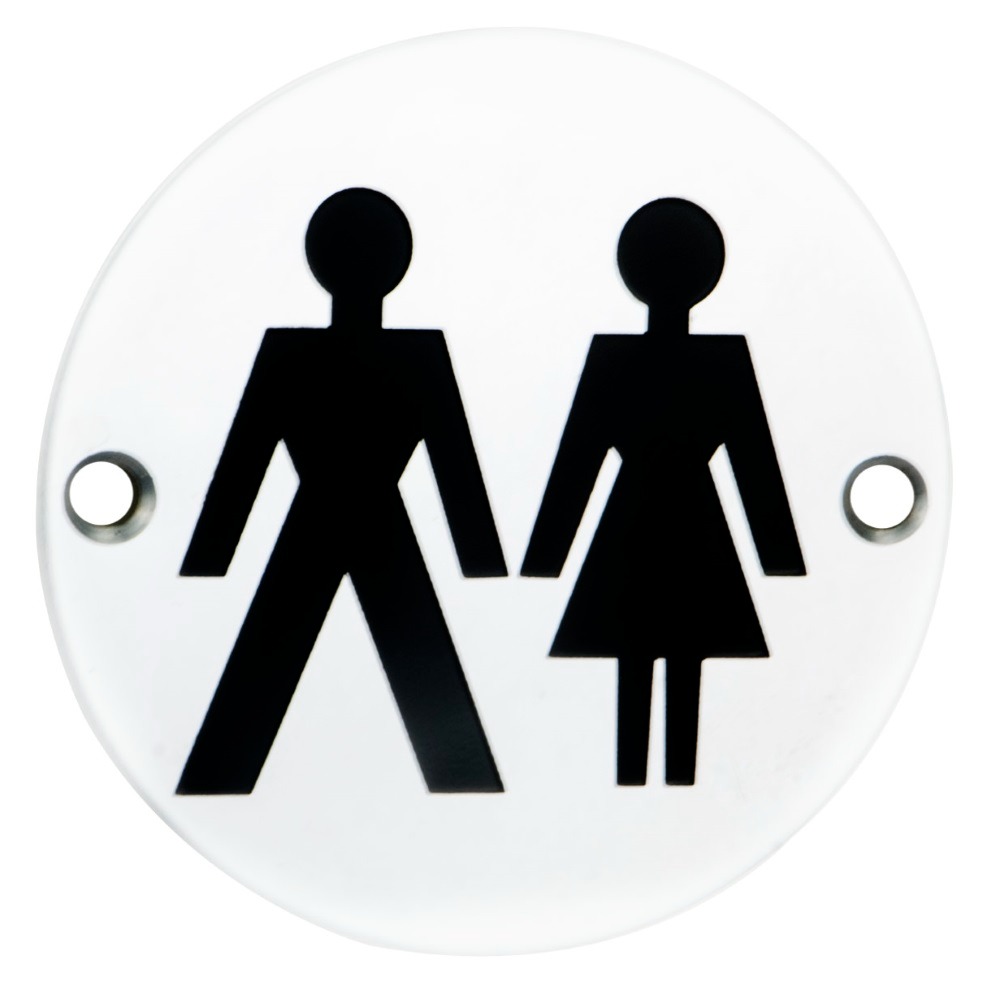 Unisex symbol sign. A standard door sign with the denoted character logo displayed on a circular aluminium plate with two fixing holes.