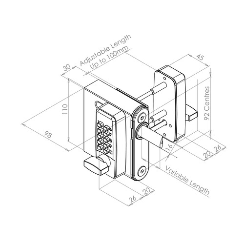 The surface-mounted version of the ProSelect digital code gate lock has a long latching movement allowing for gate expansion and contraction. The lock fits simply to the gate by drilling 3 holes into the gate frame and screw fixing the lock to the gate. Digital gate locks are a convenient method of locking a gate as no keys are required.