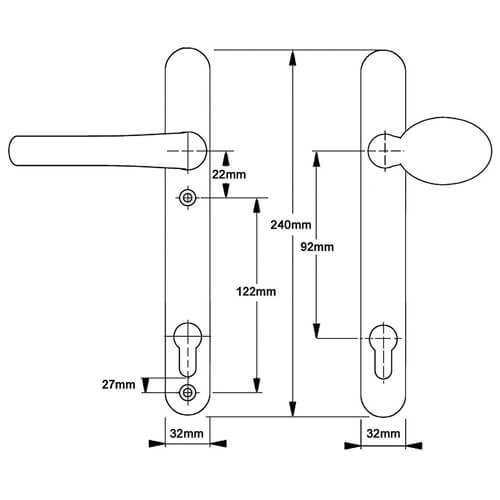 These Hoppe handles from the Atlanta range have a sprung 92pz internal lever handle and external moveable pad. With a backplate size of 240mm x 30mm they are available in various finishes.