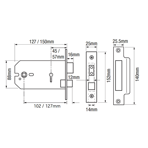 The latch is operated by a lever handle on either side, the deadbolt is operated by a key from either side. Pierced to accept 38mm bolt through furniture. The latch is easily reversible, enabling these mortice locks to be used on either side of a door.