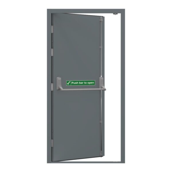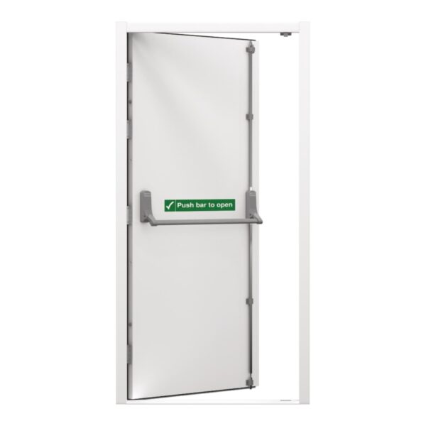 It comes fitted with an Exidor 294 (2 point locking) fire escape door push bar. Fully galvanised, pre-assembled door & frame with fitted 2 Exidor 2 point locking panic hardware.