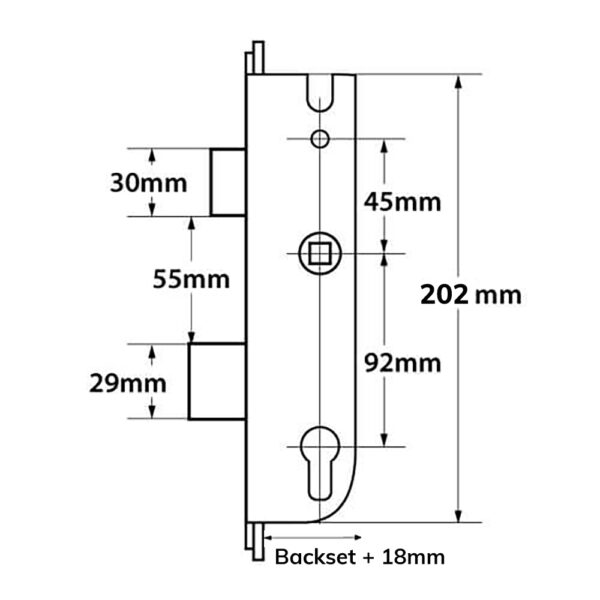 Both the latch and deadbolt on these locks measure 30mm high, with 55mm between them. They are held onto the faceplate with 3 screws. The top screw to the centre measures 102mm and the centre screw to the bottom screw measures 110mm.