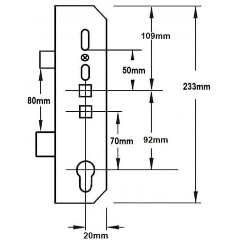 Despite the various backsets and operation options, the dimensions of Mila gearboxes are largely the same. They measure 233mm high by the backset + 20mm wide. The latch measures 20mm high, the deadbolt is 30mm high and there is 80mm between the bottom of the latch and the top of the deadbolt.