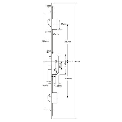 This Mila Barratt Homes multipoint door lock features 2 Rollers 2 Hooks & 1 Latch.