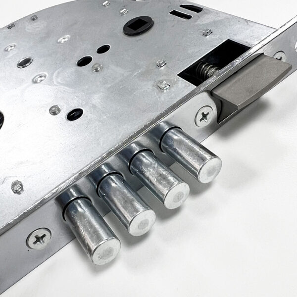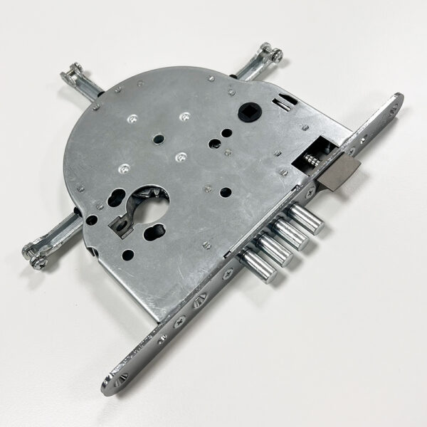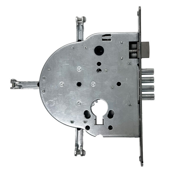 The Mut-T-Lock 4-Way Locks (235, 265) can be installed inside wood or metal doors to provide 4-way multi-bolt locking. Very common on high security commercial doors these centre locks connect to vertical and horizontal shootbolt extentions to offer 4 way locking and a very high security solution. These locks feature Key Wind operation requiring Mu-T-Lock cog cam type cylinder. The key can also retract the latch, but lever handles are also available to suit these locks (Mul-T-Lock SH300 type furniture)
