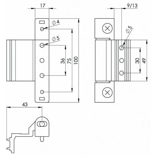 Eurogroove fitting door hinge. Use with bevelled/chamfered profile systems. 4mm horizontal adjustment without removing the door. 80kg max door weight (3 hinges). Simple screwdriver adjustment.