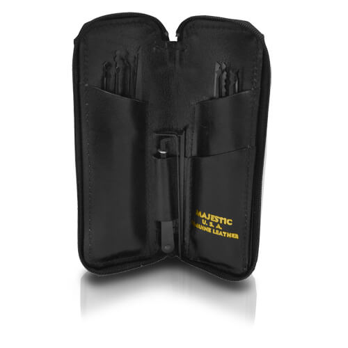 Souber Tools SS17 17 Piece Pickset. This is a real Black leather wallet with wrap round zipper closure. Each Set comprises 13 individual Picks. 6 Rake Picks, 2 Diamond Picks, 2 Ball End picks, 2 Hook picks and an Extractor. Each Pick has riveted handles made from Silver Anodised Aluminium. This enables comfort and better feel in use.