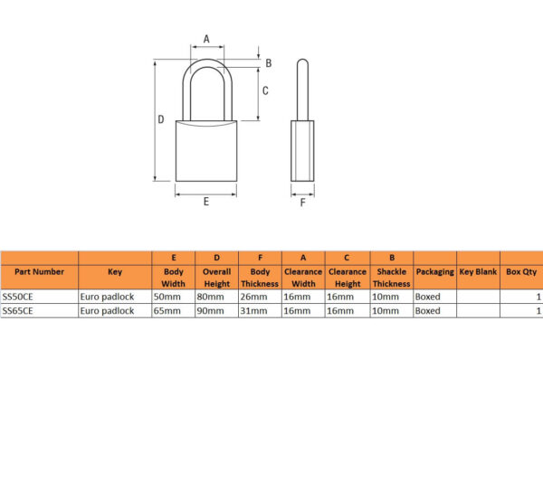 Squire’s E version of the Stronghold accepts half euro cylinders to allow it to be incorporated into masterkey systems. Close shackle in 50mm or 65mm body width.