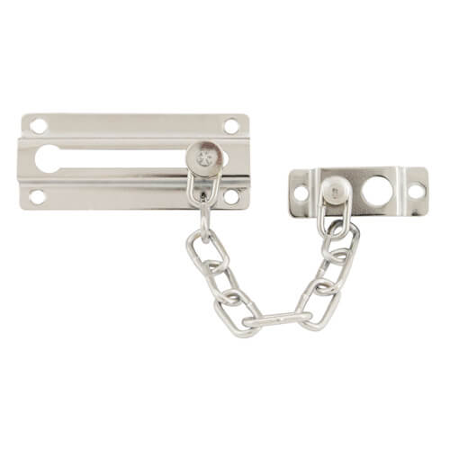 This TSS non-locking sliding door chain is a surface mounted security device that helps identify a caller before the door is fully released.