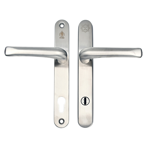 This handle has a backplate measuring 240x32mm and screw centres measuring 210mm, compatible with most 92mm PZ multipoint locks.