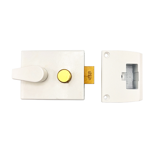 These Union Nightlatches feature a more unusual 50mm backset measurement, and available finishes are White, Satin Chrome, or Champagne Gold.