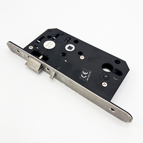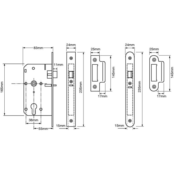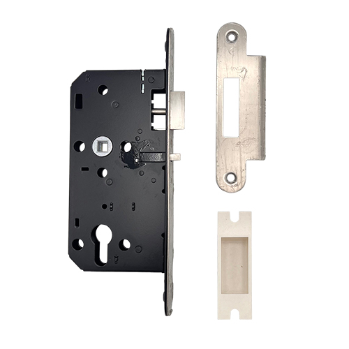 To withdraw the latch turn key from outside or via handle operation from the inside. Latchbolt is automatically locked by the anti thrust bolt below the latch when the door is closed. This lock is pierced to accept bolt through furniture with 38mm centres. Suitable for unsprung lever furniture up to a maximum weight of 0.75kg.