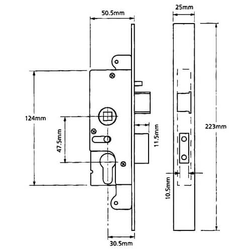 This genuine Union L22180 gearbox suits UPVC and aluminium doors and would have originally been supplied with screw-in multipoint hooks or deadbolts. Strikes and faceplates have been discontinued. The snib engages upon closing the door and automatically deadlocks the latch.
