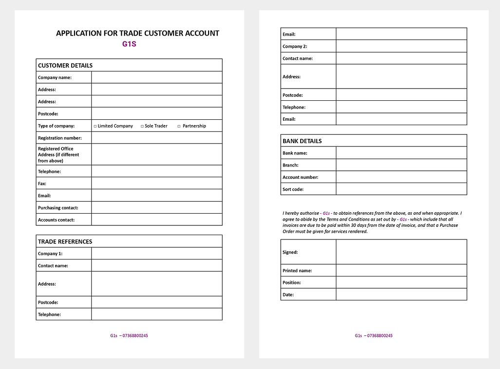 At G1s, we value strong and trustworthy relationships with our trade customers. To offer you the convenience of credit terms, we require some essential details to assess your creditworthiness.